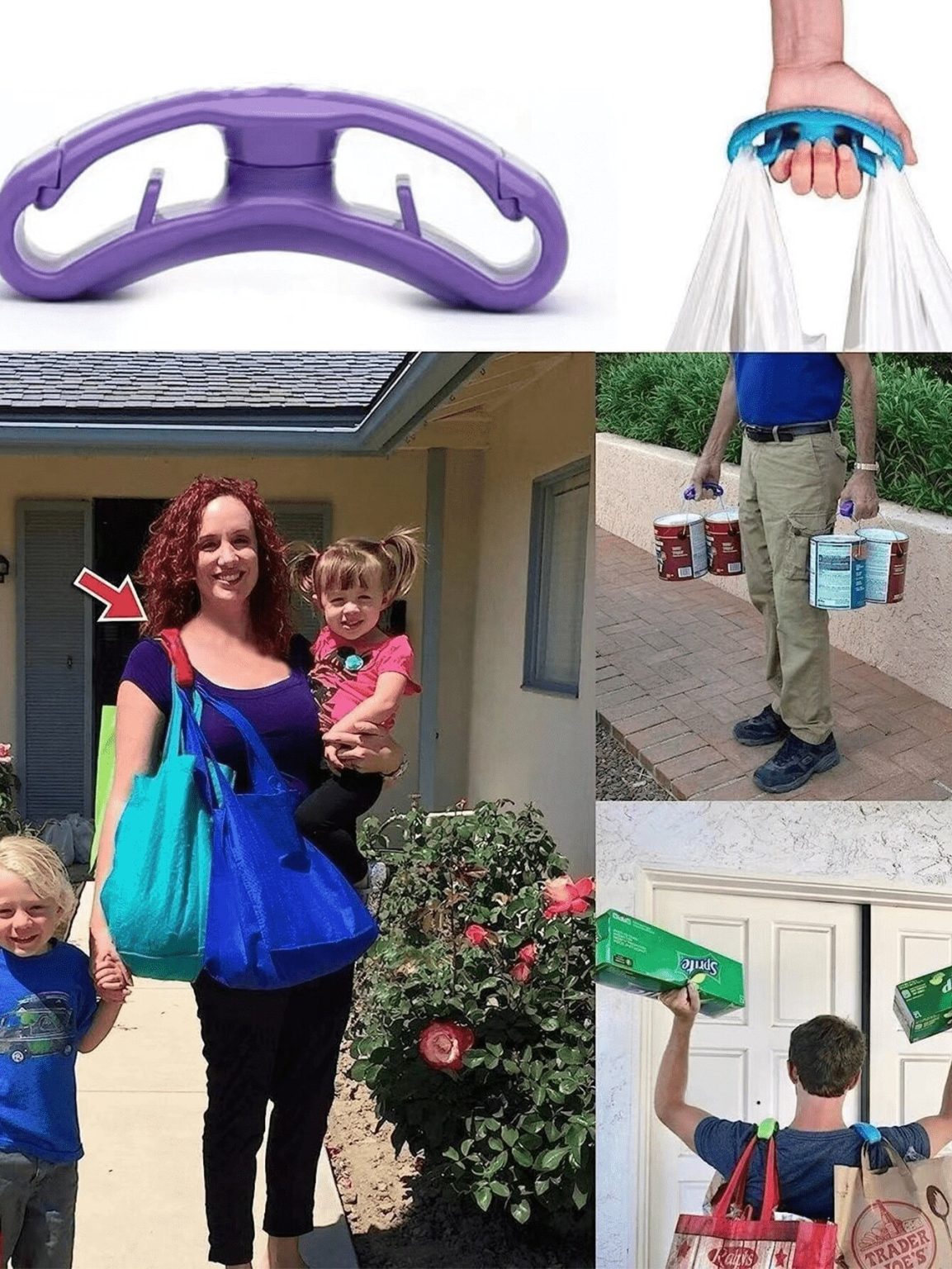 • Plastic Bag Handle is a simple, carrying device that allows shoppers to manage and carry multiple bags at once ~ comfortably, either in the hands or over the shoulder for a “hands-free” carry.